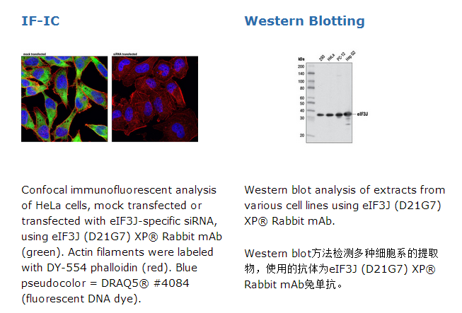 eIF3J (D21G7) XP® Rabbit mAb能够检测内源性eIF3J总蛋白水平。该单克隆抗体是经由合成的围绕人 eIF3J蛋白Val251位点的氨基酸肽段免疫动物而生产的。翻译起始阶段40S核糖体与mRNA结合需要一些因子帮助。由eIF4E、eIF4A和eIF4G组成的起始因子eIF4F复合物能够与mRNA5’-端帽子结构结合。eIF4F和eIF4B在mRNA5’非翻译区解开mRNA的二级结构。与40S核糖体亚单位相互作用的一些真核翻译起始因子包括elF3能够结合mRNA 的5'末端帽子结构,随后沿着mRNA寻找起始密码子。elF3是一个含有10到13不同亚基的大翻译起始复合物。eIF3a、eIF3b、eIF3c、eIF3e、eIF3f和eIF3h对复合物的功能起到关键性作用,它们为核心亚基。eIF3可能通过与eIF4G的相互作用促进mRNA与40S亚基结合(1)。eIF3可以使Met-tRNAi•eIF2•GTP三联体复合物稳定地结合到40S核糖体亚基上,并有助于在加入60S核糖体亚单位之后保持这个复合物的完整(2)。研究证明mTOR能够和eIF3直接相互作用(3,4)。当用激素或有丝分裂信号刺激细胞时,mTOR结合eIF3复合物,并且使S6K1磷酸化(3)。这个过程将导致S6K1从eIF3分离同时S6K1被激活。激活的S6K1随后磷酸化下游靶蛋白包括核糖体蛋白S6和eIF4B,从而最终促使翻译加强。进一步研究证明在胰岛素刺激之后,活化的mTOR信号通路能诱导eIF3和eIF4G相互联系(3)。eIF3j是eIF3最小的亚基之一,它在40S起始复合物组装起重要作用(5)。研究显示eIF3j与氨基酰位点和mRNA进入40S核糖体亚基的通道相联系(6)。研究也证明eIF3j在参与终止后复合物的循环过程也起到了额外的作用(7)。