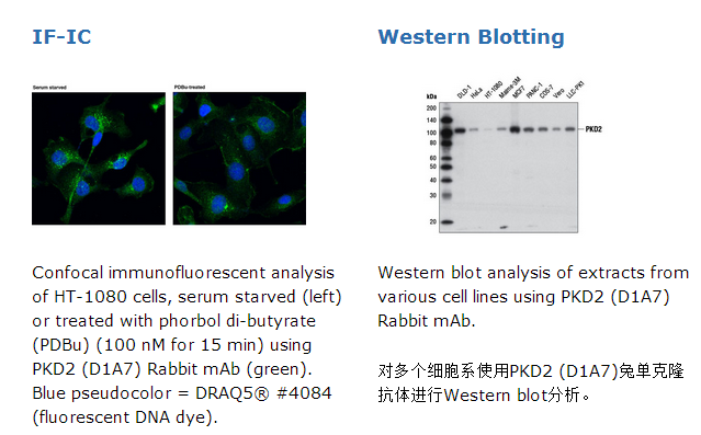 PKD2 (D1A7)兔单克隆抗体识别内源性的全部PKD2蛋白。此抗体与PKD1或PKD3蛋白没有交叉反应。该单克隆抗体用与人类PKD2蛋白中Gly491位点附近的氨基酸序列对应的人工合成肽段免疫动物而制成。蛋白激酶 D2 (PKD2)是蛋白激酶D家族中三个成员之一,包括PKD1/PKCμ 和PKD3/PKCν, 属于丝氨酸/苏氨酸蛋白激酶的钙/钙调蛋白超家族(1,2)。PKDs包含一个保守的羧基末端催化结构域,一个PH结构域标记的氨基末端调节区用以进行亚细胞坐标定位,两个锌指/C1脂质结合结构域用以调节响应甘油二酯(DAG)或佛波酯的酶活性(2,3)。除了脂质介导的激活,也可以通过酶活化环关键丝氨酸残基的磷酸化来刺激PKD的催化活性(4-8)。新型PKCs,如PKCη 和PKCε,已经显示出使PKD1 丝氨酸(744位和748位)(人PKD2中是丝氨酸(706和710位))磷酸化,从而通过PH结构域与催化结构域的相互作用,介导缓和酶抑制作用(5)。PKD亚型的磷酸化和激活也用于其他上游激酶的描述。例如,酪蛋白激酶2 (CK2)已经显示出PKD2 丝氨酸(244位)磷酸化,这将促进核内PKD2的积累、HDAC7的磷酸化和Nur77的表达(9)。虽然只有少量PKD2效应物已经确定,PKD2与一系列细胞活动的调节有关,包括细胞存活、发育、生长、迁移和转化(10-14)。PKD2介导至少一个已知底物的磷酸化,磷脂酰肌醇4 - 激酶的IIIβ(PI4KIIIβ)型,也与来自反式高尔基网络形成和调节胞吐运输小泡中的PKD2有关(15)。