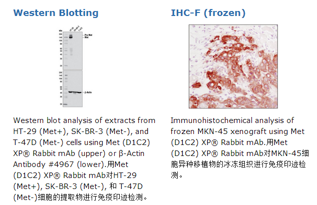 Met (D1C2) XP® 兔单抗能检测内源总Met蛋白的表达水平。单克隆抗体通过用多肽免疫动物得到,该多肽是根据人的Met蛋白羧基端序列合成的。Met作为肝细胞生长因子 (HGF, 亦作扩散因子) 的高亲和性酪氨酸激酶受体是一个二硫键连接的异二聚体,含有一个45 kDa的 α-亚基和一个145 kDa的 β-亚基 (1,2)。α-亚基和β-亚基的氨基端形成胞外区,β-亚基的其余部分跨细胞膜并且含有一个具有激酶活性的胞内区。Met和HGF相互作用会导致多个酪氨酸位点的自磷酸化,继而招募下游信号分子Gab1, c-Cbl和 PI3 K激酶(3)。这一系列基础性事件对于Met激酶相关的所有生物学功能十分重要。胞内Tyr1003位点的磷酸化对于Met的泛素化和降解是必须的(4)。激酶结构域Tyr1234/1235的磷酸化对于Met的激酶活性十分关键。胞内 Tyr1349的磷酸化为Met提供了Gab1 的直接结合位点(5)。在肾、结肠和乳腺癌中发现有Met水平和/或激酶活性的改变,因此Met是肿瘤治疗和诊断的一个靶点(6,7)。