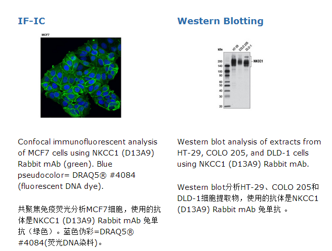 NKCC1 (D13A9) Rabbit mAb 兔单抗识别内源性的NKCC1总蛋白。此抗体与磷酸化的NKCC2蛋白没有交叉反应。该单克隆抗体由合成的人类NKCC1蛋白Arg80位点附近肽段免疫动物而制成。在电中性阳离子-氯耦合共转运(SLC12)基因家族包括布美他尼敏感的Na+/H+/Cl-(NKCC),噻嗪类敏感的Na+/Cl-,K+/CL-(KCC)共转运体。SLC12A1/NKCC2和SLC12A2/NKCC1调节细胞体积和维持细胞响应渗透和氧化应激时的稳态(1)。广泛表达NKCC1被认为在液体分泌(如唾液腺功能),水盐平衡(如维持肾素和醛固酮水平),以及神经元的发育和信号传导中发挥作用(2-7)。在神经发育中,NKCC1和KCC2在在氯离子涌入(NKCC1)和流出(KCC2)中维持良好平衡,调节γ-氨基丁酸(GABA)介导的神经传导(3)。在未成熟神经元中增加的NKCC1表达可以维持细胞内的氯的高水平,产生抑制性GABA能信号;KCC2在成熟神经元中保持细胞内氯的低水平,产生兴奋性GABA能反应(4,5,8)。删除NKCC1会损害神经生长因子介导的PC-12D细胞的突起生长,用布美他尼抑制NKCC1会抑制切断的背根神经节细胞的重新生长(6,7)。氯稳态缺陷的神经元与癫痫相关,这种癫痫可被butemanide治疗改善,这表明NKCC1和NKCC2异常表达或其信号通路可能在新生儿和成人癫痫中发挥作用(9-12)。NKCC1是作为二聚体和与其它SLC12家族成员形成异寡聚体被发现的。这种运输蛋白与氧化反应和渗透反应激酶结合,结合、磷酸化和激活NKCC1共转运体的活性(13-16)。为了应对降低的细胞内氯离子浓度,STE20相关的富含脯氨酸丙氨酸的蛋白激酶(SPAK)磷酸化NKCC1,增加共转运活动,促进氯离子涌入(16-19)。氧化应激反应激酶1(OSR1)在氧化应激反应中磷酸化和激活NKCC1(14)。