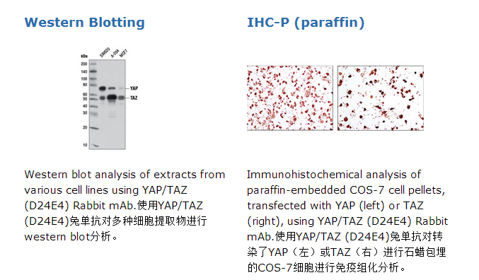 YAP/TAZ (D24E4)Rabbit mAb兔单抗识别内源性的总YAP和总TAZ蛋白。单克隆抗体是通过一种合成的肽段去免疫动物产生。这种合成的肽段与邻近人源TAZ蛋白的Asp362氨基酸残基序列一致。YAP蛋白(Yes相关蛋白,YAP65)因其与Yes的SH3结构域结合而被鉴定,它也会结合含有SH3结构域的其他蛋白,如Nck, Crk, Src, 和Abl(1)。除了SH3结合基序,YAP 还含有一个PDZ相互作用基序、卷曲螺旋结构域和WW结构域(2-4)。YAP的早期研究都指出它在锚定和靶定特异细胞组合时起作用,随后还发现YAP是转录共激活因子,其机理主要是是通过YAP的WW结构域与PEBP2转录因子和其他转录因子的PY基序(PPxY)相互作用(5,6)。由于在丝氨酸127的磷酸化,YAP蛋白依赖于AKT的与14-3-3蛋白相互作用,进而抑制p73介导的细胞凋亡(6)。YAP可能起转录抑制因子作用[7],现在被认为是一种关键的Hippo (Mst1/Mst2)信号通路调控因子[8]。YAP因此在器官大小的决定和肿瘤抑制上起关键作用[8],TAZ在Hippo信号通路中与转录共激活因子密切相关[9]。 TAZ含有一个PDZ结合基序,它与YAP的WW结构域有同源性,也被认为通过与转录因子Runx2 和 PPARγ相互作用调控间充质细胞增殖和分化间的转换,这一过程对正常组织发育和肿瘤抑制其关键作用[10]。由于它有决定MSC命运的作用,TAZ与因MSC细胞分化失调导致的一些人类疾病有临床相关性[11]。