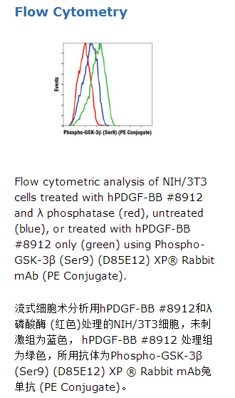 This Cell Signaling Technology antibody is conjugated to phycoerythrin (PE) and tested in-house for direct flow cytometry analysis in mouse cells. The antibody is expected to exhibit the same species cross-reactivity as the unconjugated Phospho-GSK-3β (Ser9) (D85E12) XP® Rabbit mAb #5558.