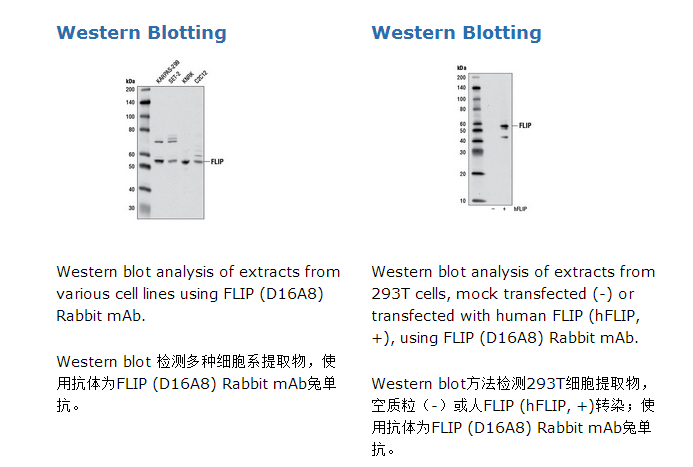 FLIP (D16A8) Rabbit mAb兔单抗能够检测内源性水平的FLIP总蛋白。该抗体也能检测FLIP的短亚型,FLIPS。该抗体能够识别某未知来源大小为70 kDa的蛋白。该单克隆抗体是采用合成的人源FLIP蛋白组氨酸(160位)周围残基相对应的肽段免疫动物而制备的。细胞的FLIP(FLICE抑制蛋白)是一种细胞凋亡调节子,其有很多种名称,如c-FLIP (1)、Casper (2)、CLARP (3)、FLAME (4)、I-FLICE (5)、MRIT (6)、CASH (7)和Usurpin (8)。FLIP以两种剪接形式选择性表达, 即短FLIP(FLIPS)和长FLIP(FLIPL)。FLIPS包含两个死亡效应域(DEDS),发现存在于死亡受体衔接蛋白FADD和caspase-8前体域。FLIPL与caspase-8(FLICE)共享重要的同源域,并包含一个额外的死亡效应域,但FLIPL缺乏半胱天冬酶的催化活性位点,并且不具有蛋白酶活性。据研究报道,这两种形式都与FADD和caspase-8前体相互作用。关于FLIP在凋亡中的作用的研究是有争议性的,一些报道是抗细胞凋亡,而另一些则是促凋亡。FLIPL的过表达可导致caspase-8异源化从而产生活性蛋白酶,进而导致细胞凋亡。然而在生理水平,研究认为FLIP结合到FADD的DED会抑制caspase-8。通过siRNA或基因打靶降低FLIP表达,会使细胞对死亡受体介导的细胞凋亡敏感。FLIP也与癌细胞凋亡的阻滞相关,在某些类型的癌症包括Hodgkin's 淋巴瘤、卵巢癌和结肠癌中上调表达(9)。
