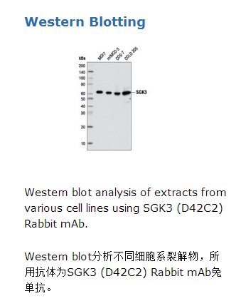 SGK3 (D42C2) Rabbit mAb兔单抗能够识别内源性SGK3总蛋白。该多克隆抗体是由合成的人源的针对SGK3蛋白Tyr487周围相对应的残基的合成肽段免疫动物而生产的。抗体由protein A和肽亲和层析技术纯化。血清和糖皮质激素诱导激酶(SGK)是一个丝氨酸/苏氨酸激酶,与Akt紧密联系(1)。SGK可以被多种刺激包括血清,糖皮质激素,卵泡刺激素,渗透压冲击和盐皮质激素迅速诱导。SGK可以被肝细胞生长因子HGF刺激的PI3K依赖的通路和整合素介导的PI3K非依赖的通路激活(2,3)。SGK的诱导和激活参与激活细胞抗凋亡和细胞周期调控(4-6)。SGK在钾,钠,氯离子通道激活中也起重要作用,表明其参与调控细胞的存活,神经元的兴奋,肾钠排泄等过程(2)。SGK被泛素化和蛋白酶体降解等过程负向调控(7)。SGK3是PI3K信号通路中的下游信号分子,它在Thr320位点被PDK1活化和磷酸化被提示为一种在肿瘤中Akt依赖的信号转导方式(8)。