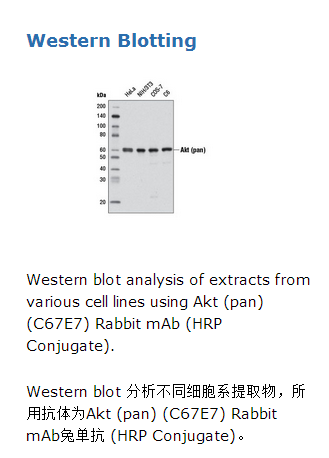 Akt (pan) (C67E7) Rabbit mAb兔单抗 (HRP Conjugate)可以检测内源性总Akt。该抗体不和其他相关蛋白发生交叉反应。单克隆抗体是采用鼠Akt羧基末端周围残基相对应的合成磷酸肽免疫动物生产的。CST公司的此抗体共价联氨尼克酰胺修饰的抗体,带有甲酰苯扎酰胺修饰的辣根过氧化物酶(HRP),HRP标记的抗体与未标记的Akt (pan) (C67E7) Rabbit mAb #4691一样可以抑制同物种间的交叉反应。Akt,又被称为PKB 或 Rac,在细胞的生长和凋亡中起到关键作用(1-3)。该蛋白激酶可以被胰岛素和多种生长和存活因子激活,在涉及PI3K激酶的wortmannin敏感信号通路中发挥作用(2,3)。Akt可由磷脂结合激活,该过程通过活化环中的Thr308位点以及羧基端Ser473位点的磷酸化完成,其中Thr308的磷酸化由PDK1完成(4)。 之前推测PDK2在Ser473位点磷酸化Akt,后被证实为哺乳动物rapamycin靶蛋白mTOR 的作用, 它存在在一个含有rictor和Sin1 的rapamycin非敏感复合体中。 Akt促进细胞的生长通过抑制细胞的凋亡 ,例如Akt可以抑制下游靶蛋白Bad (7), forkhead 转录因子 (8), c-Raf (9), and caspase-9。PTEN是PI3K/Akt信号通路的主要负调控因子(10)。 LY294002是特异性的 PI3K 激酶抑制剂(11)。Akt 的另外一个主要功能是通过磷酸化并进而抑制GSK-3α 和 β来调控糖原的合成(12,13)。 Akt 也可以调控胰岛素诱导的葡萄糖转运 (12)。除此之外,Akt还可以调控细胞周期,这个功能通过抑制GSK-3β,从而调控其下游的Cyclin D1 的磷酸化和降解 (14),或者负向调控cyclin依赖的激酶抑制因子 p27 Kip (15) 和 p21 Waf1/CIP1 (16)来实现。 Akt 也可以通过直接磷酸化含有raptor的rapamycin敏感复合体中的mTOR来调控细胞的生长(17)。 更重要的是, Akt磷酸化并失活TSC2, 而TCS2是mTOR-raptor复合物中mTOR的抑制因子(18,19)。