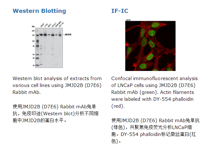 JMJD2B (D7E6) Rabbit mAb兔单抗能够检测内源性JMJD2B总蛋白水平。该抗体不与其它Jumonji C 蛋白发生交叉反应,包括JMJD2A、JMJD2C或JMJD2D蛋白。通过合成的与人源JMJD2B蛋白羧基端相应的多肽片段去免疫动物从而制备出此单克隆抗体。
