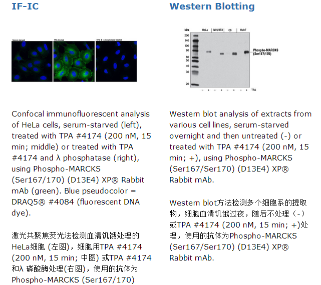 只有当丝氨酸(167和170位)磷酸化时,Phospho-MARCKS (Ser167/170) (D13E4) XP® Rabbit mAb兔单抗识别内源性的总MARCKS蛋白。该抗体也可以检测单-磷酸化MARCKS丝氨酸(167位)。该单克隆抗体通过用合成磷酸肽免疫动物制备,该合成肽与人MARCKS蛋白丝氨酸(167和170位)附近的残基一样。豆寇酰化富含丙氨酸C-激酶底物(MARCKS)是一种重要的PKC底物,在多种细胞类型中表达。 MARCKS与细胞活力,细胞粘附,吞噬,膜运输和有丝分裂有关(1)。PKC响应生长因子和氧化应激磷酸化MARCKS的丝氨酸(159,163,167和170位),调节钙/钙调蛋白结合和MARCKS丝状(F)-肌动蛋白交联反应活性(2-4)。PKC磷酸化作用导致MARCKS从细胞膜到细胞质迁移(5)。