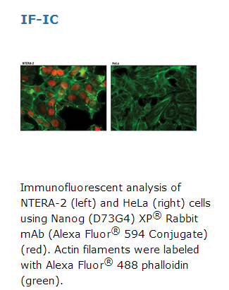 Nanog (D73G4) XP®Rabbit mAb (Alexa Fluor®594 Conjugate) detects endogenous levels of total nanog protein.
