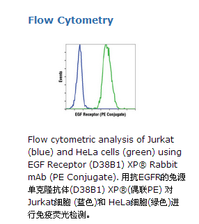 This Cell Signaling Technology antibody is conjugated to phycoerythrin (PE) and tested in-house for direct flow cytometry analysis in human cells. The antibody is expected to exhibit the same species cross-reactivity as the unconjugated EGF Receptor (D38B1) XP® Rabbit mAb #4267.