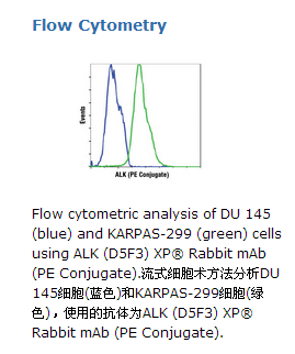 ALK (D5F3) XP® Rabbit mAb (PE Conjugate) detects endogenous levels of total ALK protein as well as ALK fusion proteins, such as EML4-ALK variants and NPM-ALK, even at low levels. This antibody does not cross-react with other family members.