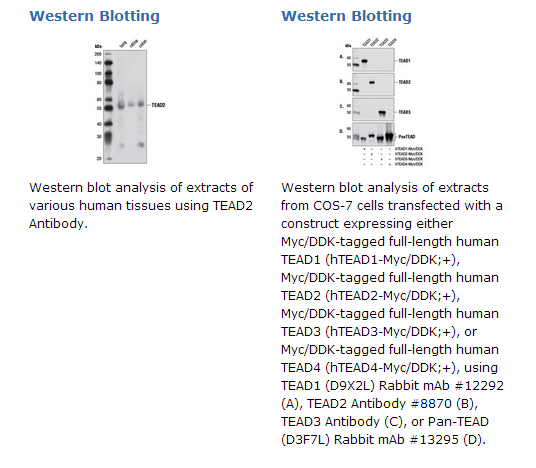 TEAD2 Antibody recognizes endogenous levels of total TEAD2 protein. This antibody does not cross-react with other TEAD family member proteins.