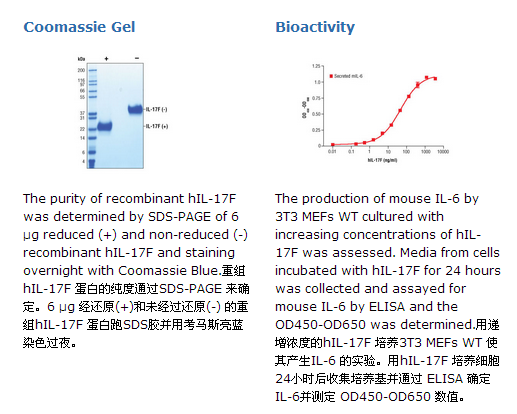 CST公司生产的人重组蛋白 IL-17F (hIL-17F) Arg31-Gln163 (Accession #NP_443104)是从人的293细胞表达而来。重组的hIL-17F蛋白没有标签,未糖基化的蛋白分子量据推算为14,903Da。DTT-还原的蛋白分子作为22 kDa的蛋白而迁移。在SDS-PAGE中具稍低的迁移率是由于糖基化。未还原的蛋白由胱氨酸连接形成同源二聚体而作为38kDa 蛋白迁移。重组hIL-17F蛋白的N-末端RKIPK的序列通过测序得到。6 μg 还原 (+) 和 非还原的(-) 重组hIL-17F通过SDS-PAGE检测,纯度大于98%,所有批次的纯度均高于98%。hIL-17F的生物活性是通过诱导3T3 MEFs WT产生IL-6能力的实验来确定的。每个批次的ED50在30-80 ng/ml之间。