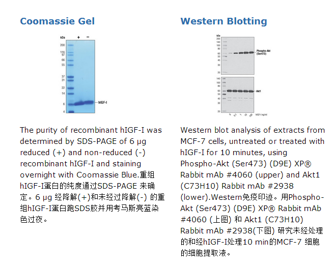 CST公司生产的人源重组蛋白IGF-I (hIGF-I) Gly49-Ala118 (Accession #P01343)是从大肠杆菌细胞表达而来。重组的hIGF-I蛋白在末端有Met标签,其分子量据推算为7,785Da。DTT-降解蛋白作为一个6kDa的蛋白而转移。重组hIGF-I蛋白的N-末端MGPET的序列通过测序得到。6 μg 还原 (+) 和 非还原的(-) hIGF-I通过SDS-PAGE检测,纯度大于98%,所有批次的纯度均高于98%。重组蛋白hIGF-I的生物活性是通过人源皮肤成纤维细胞的增殖实验确定的。每个批次的ED50值在2-8 ng/ml之间。内毒素含量:小于0.01 ng /1 μg hIGF-I。
