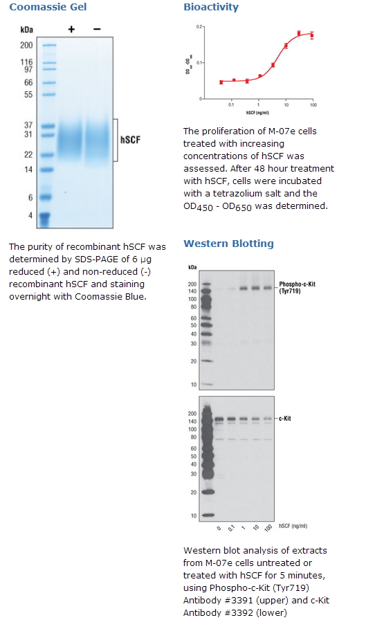 CST公司的重组人SCF(hSCF) 蛋白Glu26-Ala189 (Accession #P21583)在人293细胞表达获得。重组hSCF蛋白不带标签,非糖基化蛋白分子量是18,458。DTT-还原和非还原蛋白迁移位于22-35 kDa。SDS-PAGE中低迁移速率和蛋白异质性是由糖基化引起的。重组hSCF氨基端EGICR通过蛋白质测序验证。重组hSC蛋白F经过还原(+)和非还原(-)SDS-PAGE验证,所有批次纯度大于98%。重组hSCF的生物活性在M-07e细胞增殖实验中检测,每一批次的ED50在2-6ng/ml之间。1ug hSCF含有内毒素量低于0.01ng。包含载体蛋白形式:PBS缓冲液,pH 7.2 包含20 μg BSA 每1 μg hSCF用0.22um滤膜过滤后冻干。不含载体蛋白形式:pH 7.2 PBS经过0.22um滤膜过滤后冻干。SCF存在于内皮细胞,成纤维细胞,角质化细胞,肠上皮细胞和癌细胞(1,2)。SCF对于造血作用和肥大细胞的分化非常重要,并且也在其他类型细胞的生存等调控中扮演角色(1)。一些肿瘤细胞的增殖和侵袭受SCF蛋白起始(3)。肿瘤来源的SCF似乎涉及骨髓来源的抑制细胞的增殖,这种抑制细胞会限制肿瘤-侵润-T细胞的扩增(4)。SCF在肿瘤微环境中也有其他作用(2)。SCF可以以可溶蛋白状态或嵌膜蛋白状态存在,它的存在形式决定于剪切或蛋白水解释放的不同异构体(1)。SCF可以与酪氨酸激酶受体c-Kit结合,随后激活Akt, Erk, JNK和p38 信号通路 (5,6)。