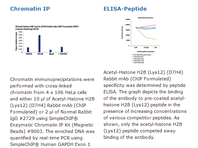 Acetyl-Histone H2B (Lys12) (D7H4) Rabbit mAb 兔单抗(ChIP Formulated)能够检测仅在Lys12位点乙酰化的内源性histone H2B蛋白。该抗体不能与Lys5、Lys15或Lys20位点乙酰化的histone H2B发生交叉反应。该单克隆抗体是采用合成的与人源histone H2B蛋白Lys12位点周围相应的乙酰化的片段免疫动物而成产的。核小体是由四种中心组蛋白(H2A、H2B、H3和H4)组成,它是染色质的主要构件模块。起初被认为是一个DNA包装的静态支架,目前组蛋白已经被认为是一个动态蛋白,其经历多种形式的翻译后修饰,包括乙酰化作用、磷酸化作用、甲基化作用和泛素化作用(1,2)。在转录激活期间,p300/CBP组蛋白乙酰化转移酶在histone H2B (Lys5、12、15和20)基因启动子的氨基端使多个赖氨酸残基乙酰化 (1-3)。组蛋白尾部的高度乙酰化中和了这些区域的正电荷,并且被认为弱化了组蛋白-DNA和核小体-核小体的相互作用,因此使核染色质不稳定以及增加了DNA与不同的DNA结合蛋白的接近程度(4,5)。此外,特定的赖氨酸残基乙酰化产生了停留点,这些位置有助于招募许多转录和染色质调节蛋白,这些蛋白包含一个bromodomain,该区域能结合到乙酰化的赖氨酸残基(6)。在转录激活期间,通过RAD6 E2蛋白连接BRE1A/BRE1B E3 ligase (also known as RNF20/RNF40)从而使Histone H2B在Lys120位点发生单泛素化(7)。单泛素化的histone H2B Lys120是与活化基因的转录区域有关联,并且通过促进FACT依赖的染色质重构从而刺激转录延伸(7-9)。此外,对于随后的histone H3在Lys4 和Lys79位点的甲基化有本质作用,这两个附加的组蛋白修饰能调节转录起始和延伸(10)。在代谢应激的反应下,AMPK被招募到反应性基因以及使histone H2B在Lys36位点磷酸化,这都发生在基因的启动子和转录区域,以及这些可能调节转录的延伸(11)。在多种凋亡刺激下,histone H2B通过Mst1激酶使其Ser14位点磷酸化(12)。在凋亡的诱导下,Mst1激酶被剪切,并且通过caspase-3激活,导致在染色质浓缩期间histone H2B整体的磷酸化。有趣的是,在小鼠胚胎成纤维细胞中histone H2B在照射诱导DNA损伤点发生快速磷酸化(13)。既然这样,在Ser14位点的磷酸化是快速的,这取决于在H2AX Ser139位点的优先磷酸化,并且是发生在没有凋亡情况下,从而认为Ser14位点磷酸化可能在DNA损伤的修复和凋亡中有明显的作用。
