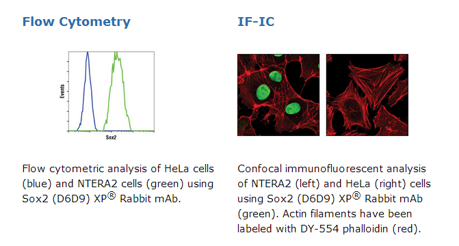 Oct-4A (C30A3) Rabbit mAb detects endogenous levels of total Oct-4A protein. Sox2 (D6D9) XP® Rabbit mAb detects endogenous levels of total Sox2 protein. Nanog (D73G4) XP® Rabbit mAb detects endogenous levels of total nanog protein. LIN28A (D84C11) XP® Rabbit mAb detects endogenous levels of total LIN28A protein. c-Myc (D84C12) XP® Rabbit mAb detects endogenous levels of total c-Myc protein. This antibody is not recommended for detection of Myc-tagged fusion proteins (use Cell Signaling Technology cat. #2276 or #2278). KLF4 Antibody detects endogenous levels of total KLF4 protein by western blot, but for immunofluorescence it is only recommended for detection of exogenously expressed KLF4 protein. All components of this kit have been validated for reactivity to human protein, however some components also have additional species cross reactivities. Please see www.cellsignal.com for additional specificity/sensitivity information for individual kit components.