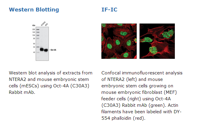 Nanog (D73G4) XP®Rabbit mAb detects endogenous levels of total Nanog protein. Oct-4A (C30A3) Rabbit mAb detects endogenous levels of total Oct-4A protein. Sox2 (D6D9) XP®Rabbit mAb detects endogenous levels of total Sox2 protein.
