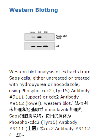 Phospho-cdc2 (Tyr15) Antibody 能够检测内源性酪氨酸(15位)磷酸化的cdc2, CDK2 和CDK5蛋白。该抗体不与CDK4, CDK6或CDK7发生交叉反应,但能够识别酪氨酸19位磷酸化cdc2 (cdc28)蛋白的酵母同源序列。该多克隆抗体是由合成的人源的针对cdc2蛋白酪氨酸(15位)磷酸化肽段免疫动物,利用A蛋白和多肽亲和层析方法纯化生产的。cdc2蛋白激酶的激活参与调节真核细胞进入有丝分裂,cdc2的激活受多个步骤的调控,包括周期蛋白的结合、cdc2苏氨酸161位的磷酸化(1)。然而,在细胞进入有丝分裂的过程中,激活cdc2的决定性步骤是苏氨酸14位和15位的去磷酸化(2)。Wee1 和 Myt1蛋白激酶通过磷酸化cdc2苏氨酸14位和15位,抑制cdc2活性(3,4)。而cdc25磷酸酯酶可能起到使cdc2苏氨酸14位和15位去磷酸化从而激活cdc2的作用(1,5)。