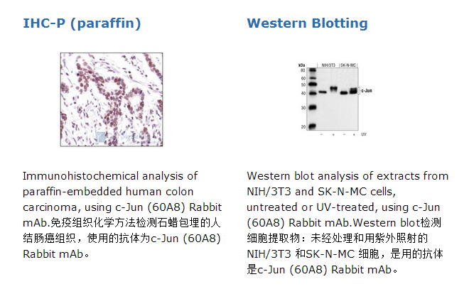 c-Jun (60A8) Rabbit mAb兔单抗能够检测内源性c-Jun总蛋白水平,无论是否被磷酸化。该单克隆抗体是采用与人源c-Jun蛋白胺端序列相一致的合成GST-c-Jun蛋白免疫动物而产生的。c-Jun是Jun家族的一个成员,Jun家族成员包括c-Jun, JunB, 和 JunD。c-Jun是转录因子激活蛋白-1(AP-1)的一个组分。AP-1是由Fos和Jun形成的二聚体以及 ATF家族成员组成的,能够结合并激活TRE/AP-1元件的转录(1)。包括生长因子,细胞因子和压力在内的细胞外信号能够激活AP-1依赖的转录过程。C-Jun的转录活性是通过SAPK/JNK对其中的Ser63和Ser73的磷酸化来调控的(2)。小鼠敲除实验表明c-Jun对于胚胎形成是至关重要的(3),进一步的研究发现c-Jun在多种组织和发育过程中发挥作用,包括轴突再生(4),肝脏再生(5)和T细胞发育(6)。AP-1所调控的基因发挥了多种生物学功能,包括细胞增殖、分化、凋亡、转化,侵润和转移,这依赖于细胞种类和具体情况(7-9)。其他的AP-1所调控的靶基因还能够调节细胞存亡,以及低氧和血管生成(8,10)。研究提示c-Jun可以作为癌症、血管重构、急性炎症反应和风湿性关节炎的重要治疗靶点(11,12)。