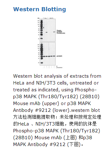 Phospho-p38 MAPK (Thr180/Tyr182) (28B10) Mouse mAb鼠单抗能够检测内源性Thr180位点和Tyr182位点共磷酸化的p38 MAPK蛋白水平。该抗体不能与p42/44 MAPK(Erk1/2)和SAPK/JNK的相关磷酸化形式发生明显的交叉反应。该单克隆抗体是采用合成的与人源p38 MAPK蛋白Thr180/Tyr182位点周围残基相一致的磷酸化肽段免疫动物而获得。p38 MAP kinase (MAPK),也被称为RK (1)或CSBP (2),是酵母中HOG激酶在哺乳动物中的同源蛋白,在细胞因子和应急诱导的信号转导过程中起重要作用。(1-4)。已经发现了4种亚型的p38 MAPK,分别是p38α, β, γ(也被称为Erk6或 SAPK3)以及δ (也被称为 SAPK4)。与SAPK/JNK通路类似,p38 MAPK可以被多种细胞压力所激活,包括渗透压休克,炎症因子,脂多糖(LPS),紫外线照射和生长因子(1-5)。MKK3, MKK6和SEK能够使p38 MAPK的Thr180 和Tyr182位点磷酸化,从而激活p38 MAPK。激活的p38 MAPK能够磷酸化并激活MAPKAP kinase 2 (3),进而最终磷酸化ATF-2 (5), Max (6)和MEF2等转录因子(5-8)。SB203580 (4-(4-fluorophenyl)-2-(4-methylsulfinylphenyl)-5-(4-pyridyl)-imidazole)是p38 MAPK的选择性抑制剂。该复合物通过抑制p38 MAPK及后续HSP27的磷酸化,抑制MAPKAPK-2的激活(9)。SB203580能够结合到p38 MAPK与ATP结合的位置从而抑制p38 MAPK的催化活性,但不会通过上游激酶抑制p38 MAPK的磷酸化(10)。