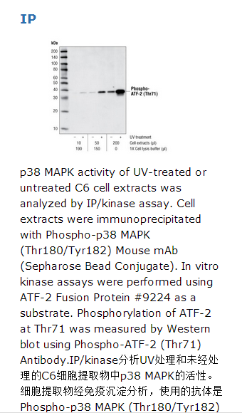 Phospho-p38 MAPK (Thr180/Tyr182) Mouse mAb (Sepharose Bead Conjugate)能结合Thr180和Tyr182位点双磷酸化的p38 MAPK蛋白。该抗体通过碳水化合物与琼脂糖酰肼珠的结合而固定。该抗体不能与p42/44 MAPK和SAPK/JNK的磷酸化形式以及非磷酸化的p38 MAP发生明显的交叉反应。该多克隆抗体是采用合成的与人源p38 MAPK蛋白Thy180/Tyr182位点周围残基相一致的磷酸化肽段免疫动物而获得。p38 MAP kinase (MAPK),也被称为RK (1)或CSBP (2),是酵母中HOG激酶在哺乳动物中的同源蛋白,在细胞因子和应急诱导的信号转导过程中起重要作用。(1-4)。已经发现了4种亚型的p38 MAPK,分别是p38α, β, γ(也被称为Erk6或 SAPK3)以及δ (也被称为 SAPK4)。与SAPK/JNK通路类似,p38 MAPK可以被多种细胞压力所激活,包括渗透压休克,炎症因子,脂多糖(LPS),紫外线照射和生长因子(1-5)。MKK3, MKK6和SEK能够使p38 MAPK的Thr180 和Tyr182位点磷酸化,从而激活p38 MAPK。激活的p38 MAPK能够磷酸化并激活MAPKAP kinase 2 (3),进而最终磷酸化ATF-2 (5), Max (6)和MEF2等转录因子(5-8)。SB203580 (4-(4-fluorophenyl)-2-(4-methylsulfinylphenyl)-5-(4-pyridyl)-imidazole)是p38 MAPK的选择性抑制剂。该复合物通过抑制p38 MAPK及后续HSP27的磷酸化,抑制MAPKAPK-2的激活(9)。SB203580能够结合到p38 MAPK与ATP结合的位置从而抑制p38 MAPK的催化活性,但不会通过上游激酶抑制p38 MAPK的磷酸化(10)。