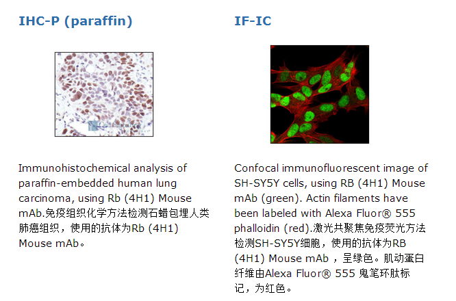 该抗体不与Rb同源蛋白p107或p130或其他蛋白发生交叉反应。该单克隆抗体是由Rb-C Fusion Protein #6022包含人类Rb蛋白701-928氨基酸残基的肽段免疫动物生产的。视网膜母细胞瘤肿瘤抑制蛋白Rb通过控制细胞周期的G1期限制点的进程来调控细胞增殖(1)。Rb具有3个功能特异的结合结构域并能够与转录因子家族的关键调节蛋白E2F、c-Abl酪氨酸激酶和具有保守的LXCXE模体蛋白相互作用(2-4)。CDK介导的细胞周期依赖性磷酸化能够抑制Rb靶向结合并允许细胞周期进程(5)。Rb的失活和随后的细胞周期进程似乎需要伴随周期蛋白E-CDK2磷酸化的cyclin D-CDK4/6初始磷酸化(6)。离体已经观察到不同CDK/cyclin复合物的特异性(6-8),而且周期蛋白D1为第780位丝氨酸在体磷酸化所必需(9)。