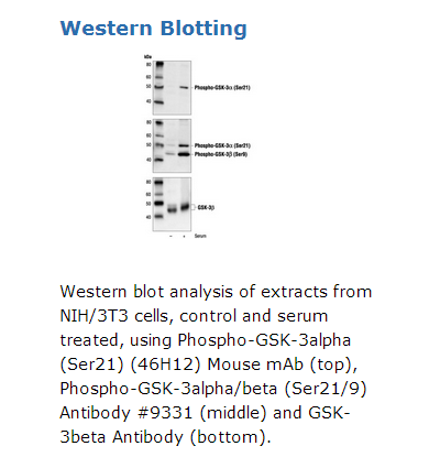 Phospho-GSK-3α (Ser21) (46H12) Mouse mAb鼠单抗可以检测Ser21位点发生磷酸化的内源性GSK-3α水平 。单克隆抗体是采用合成的与人源GSK-3α蛋白Ser21周围序列相对应的磷酸肽免疫动物生产的。糖原合酶激酶-3(GSK-3)最初被确认为是一种能在胰岛素的刺激下参与调节糖原合成的酶(1)。GSK-3是一个广泛表达的丝氨酸/苏氨酸蛋白激酶,可以磷酸化并抑制糖原合成酶的活性。GSK-3是PI3K/ Akt细胞存活通路上的一个关键下游分子,其活性可以被Akt介导的GSK-3α的Ser21位点和GSK-3β的Ser9位点的磷酸化抑制(2,3)。GSK-3不仅参与盘基网柄菌细胞命运的调控,而且是果蝇,爪蟾和哺乳动物发育过程中所需的Wnt信号通路的一个组成部分(4)。GSK-3还参与调节Cyclin D1 蛋白降解和亚细胞定位(5)。