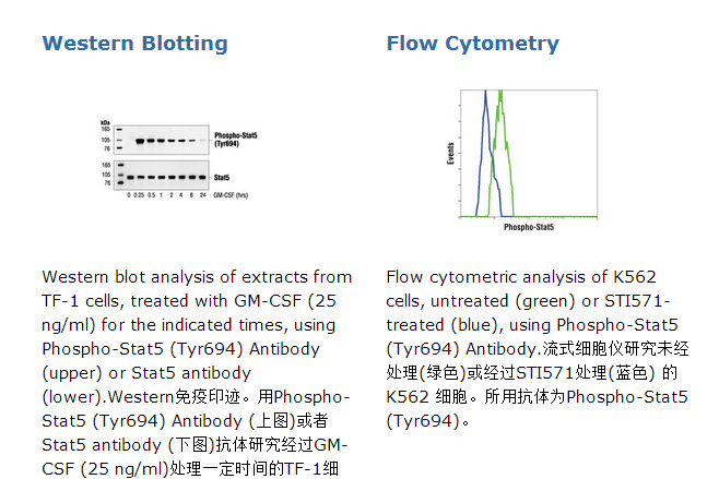 Phospho-Stat5 (Tyr694) Antibody detects endogenous levelsof Stat5a only when phosphorylated at Tyr694 and Stat5b when phosphorylated at Tyr699. The antibody does not cross-react with the corresponding phospho-tyrosine residues of other Stat proteins, but does cross-react with EGFR.