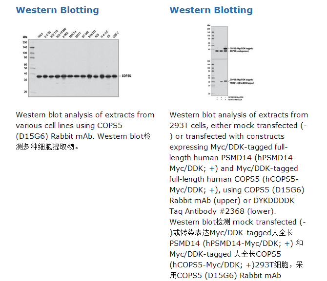 COPS5 (D15G6) Rabbit mAb recognizes endogenous levels of total COPS5 protein. This antibody does not cross-react with PSMD14/POH1.