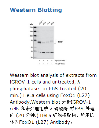 FoxO1 (L27) Antibody detects endogenous levels of total FoxO1 protein and does not cross-react with endogenous FoxO3a or FoxO4. The antibody also cross-reacts with an unidentified protein at 95 kDa.