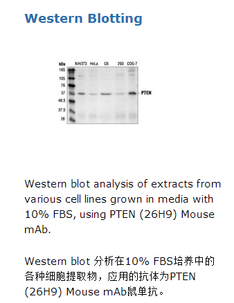 PTEN (26H9) Mouse mAb鼠单抗可以检测内源性的PTEN总蛋白,此抗体不与相关蛋白发生交叉反应。单克隆抗体是采用人类PTEN蛋白羧基末端序列相对应残基的合成肽段免疫小鼠生产的。抗体采用蛋白A和肽亲和色谱法纯化。PTEN(phosphatase and tensin homologue deleted on chromosome ten),也称为MMAC( (mutated in multiple advanced cancers)磷酸酶,是一种存在于多种人类癌症中的肿瘤抑制因子(1)。PTEN编码一个403个氨基酸组成的多肽,最初被认为是一个双特异性蛋白磷酸酶(2)。PTEN的主要底物是3磷酸肌醇激酶(PI3K)激活转化生成的肌醇磷脂(3)。PTEN是PI3K/Akt信号通路的一个主要的负调因子(1,4,5)。PTEN有一个羧基端的非催化调控的结构域,其中含有3个可以调节PTEN的稳定性,也可能影响其生物活性的磷酸化位点(Ser380,Thr382,Thr383)(6,7)。PTEN调节p53蛋白水平和活性(8),并在趋化过程中参与G蛋白偶联信号转导(9,10)。