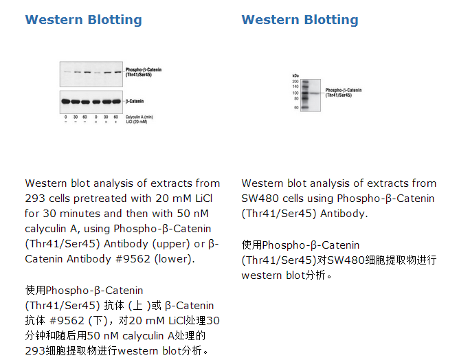Phospho-β-Catenin (Thr41/Ser45) Antibody detects endogenous levels of beta-catenin only when phosphorylated at Thr41 or Ser45. This antibody does not recognize β-catenin phosphorylated at other sites.