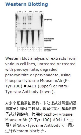 Nitro-Tyrosine Antibody detects proteins and peptides containing nitro-tyrosine in a manner independent of the surrounding amino acid sequence. It is a valuable tool for identifying new nitrated proteins as well as for assaying protein nitration and measuring levels of nitrated proteins in tissues and samples. The antibody does not cross-react with unmodified tyrosine or with phospho-tyrosine. (U.S. Patent No's.: 6,441,140; 6,982,318; 7,259,022; 7,344,714; U.S.S.N. 11,484,485; and all foreign equivalents.)