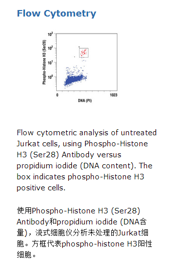 Phospho-Histone H3 (Ser28) Antibody检测仅在Ser28位点磷酸化的内源性histone H3的蛋白水平。该抗体不能与其他磷酸化的组蛋白发生交叉反应,包括phospho-histone H3 (Ser10)。通过合成的histone H3蛋白氨基末端Ser28位点周围相应的磷酸化片段去免疫动物从而制备出此多克隆抗体。通过蛋白A和多肽亲和层析纯化获得。染色质结构的修饰在调节真核细胞的转录中扮演着重要的角色。由DNA围绕和八聚体组蛋白(H2A,H2B,H3和H4各两个)共同组成的核小体是染色质的主要组成(1)。核小体的组蛋白氨基酸尾端进行不同的转录后修饰,包括乙酰化,磷酸化,甲基化和泛素化(2-5)。这些修饰通过不同的刺激产生并且对转录因子能否接近染色质有着直接的影响,所以也影响着基因的表达(6)。在大多数的物种中组蛋白H2B主要在Lys5,,12,,15和20位点上发生乙酰化(4,7)。组蛋白H3主要是在Lys9,14,18,23,27和56位点上发生乙酰化。在某些物种里H3上的Lys9位点发生乙酰化并应该在组蛋白沉积和染色质组装中扮演着重要的角色(2,3)。组蛋白H3上Ser10,Ser28和Thr11位点的磷酸化在有丝分裂和无丝分裂中都与染色质的缩合紧密相连(8-10)。H3的Thr3位点的磷酸化在许多物种中都是高度保守的,是由kinase haspin所催化的。在哺乳动物中用磷酸化特异性的抗体做免疫组化显示H3的Thr3位点在有丝分裂的前期发生磷酸化,后期发生去磷酸化(11)。