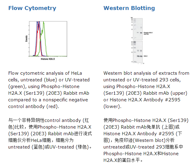 Phospho-Histone H2A.X (Ser139) (20E3) Rabbit mAb能够检测仅在serine139位点磷酸化的内源性H2A.X总蛋白水平。通过合成的与人源H2A.X蛋白Ser139位点周围相应的磷酸化片段去免疫动物从而制备出此单克隆抗体。在正常人源成纤维细胞中,组蛋白H2A.X是一种变异的组蛋白,大约占H2A组蛋白总量的10%(1)。在双链DNA中断之后,checkpoint介导的细胞周期终止和DNA修复都需要H2A.X的参与(1)。由电离辐射、紫外线或辐射物质引起的DNA损伤导致由PI3K-like激酶包括ATM、ATR和DNA-PK催化H2A.X蛋白在Ser13位点的快速磷酸化(2,3)。在DNA损伤后的数分钟内,H2A.X将会在DNA损伤部位的Ser139位点上发生磷酸化(4)。在DNA的损伤反应下,这个非常早期事件对于多个DNA损伤反应蛋白包括MDC1、NBS1、RAD50、MRE11、53BP1和BRCA1的招募是需要的(1)。除了在DNA的损伤修复中起作用,在细胞凋亡期间,对于DNA的片段化是需要H2A.X,并且在凋亡信号刺激下不同的激酶被磷酸化。通过在死亡受体的活化下的DNA-PK、在UV-A辐射下的c-Jun N-terminal Kinase (JNK1)以及在血清饥饿下的p38 MAPK ,促使H2A.X在Ser139位点磷酸化(5-8)。在受损的细胞中,通过WSTF(Williams-Beuren syndrome transcription factor)促使H2A.X在Tyr142位点持续地磷酸化(9,10)。在DNA损伤发生时,通过招募EYA1和EYA3磷酸酶使在DNA损伤位点已磷酸化的Ser139、Tyr142位点发生去磷酸化(9)。当在Ser139位点磷酸化有利于招募DNA修复蛋白和凋亡蛋白到损伤部位的时候,Tyr142位点的磷酸化似乎确定这类蛋白被招募。H2A.X在Tyr142位点的磷酸化将阻止DNA修复蛋白的募集,并且促进凋亡前因子例如JNK1的结合(9)。在只表达突变H2A,X(Y142F)的鼠胚胎成纤维细胞中,该细胞相对于凋亡蛋白更倾向于DNA修复蛋白的招募,其在电离辐射反应下显示有个降低的凋亡反应(9)。因此,H2A.X的Tyr142位点磷酸化和去磷酸化之间的平衡提供了一个在DNA受损后决定细胞命运的开关机制。