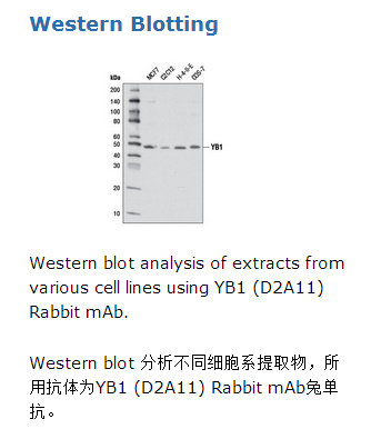 YB1 (D2A11) Rabbit mAb兔单抗检测内源性的总YB1蛋白.该单克隆抗体是由人源YB1蛋白羧基端附近的合成肽段免疫动物而生产的。Y-box结合蛋白1(YB1)属于一类进化上保守的,多功能Y-box蛋白,和单链DNA和RNA结合,调控转录,RNA代谢和蛋白质的合成(1)。YB1与多种基因启动子中的Y-box序列(TAACC)结合,并能正向或负向调节转录。YB1激活与增殖和癌症相关的基因,如周期蛋白A,B1,基质金属蛋白酶-2(MMP-2),及多药耐药性1(MDR1)基因(2-4)。YB1抑制与细胞死亡有关的基因,包括细胞的Fas相关死亡受体和p53抑癌基因(5-7)。它还与RNA剪切因子SRp30c互作并且能够稳定诱导T淋巴细胞的白细胞介素2的mRNA(8,9)。YB1蛋白主要定位于细胞质,少量存在于细胞核中;然而,核里面的YB1对促进细胞增殖十分关键。核转运受到细胞周期调控,在G1 / S期YB1蛋白质积累在细胞核中(2)。此外,细胞受到外部刺激,如高温和紫外线照射,或着用凝血酶,干扰素,胰岛素样生长因子(IGF-1)处理后可以诱导发生核转运(2,10)。IGF-1处理MCF7乳腺癌细胞株诱发Akt介导的YB1(Ser102)磷酸化,促进YB1的核转运及非贴壁依赖性生长(10)。YB1在许多恶性肿瘤组织中高表达,包括乳腺癌,非小细胞肺癌,卵巢癌,人骨肉瘤,大肠癌,恶性黑色素瘤。核YB1表达与过度增殖,耐药性,及肿瘤的不良预后相关(2,7,10)。