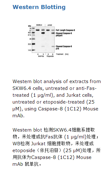Caspase-8 (1C12) Mouse mAb 鼠单抗能够检测全长caspase-8 (57 kDa),裂解的中间体p43/p41和caspase-8活化片段p18。该抗体不与其它caspases发生交叉反应。该多克隆抗体是采用合成的人源caspase-8的p18片段C端氨基序列相对应的肽段免疫动物后获得。该抗体保存在含50% 甘油和低于0.02% 叠氮化钠的HEPES缓冲液中。CD95受体(Fas/APO-1)和肿瘤坏死因子受体1(TNFR1)诱导的凋亡激活了caspase-8,并导致caspase-8释放活化片段p18和p10(1-3)。活化的caspase-8 裂解并活化下游的效应caspases,如caspase-1、-3、-6和-7。Caspase-3最终引起凋亡的形态学特征变化,包括DNA的片段化和细胞固缩。