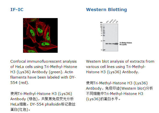 Tri-Methyl-Histone H3 (Lys36) Antibody检测仅在Lys36位点三甲基化的内源性histone H3的蛋白水平。该抗体不能与Lys36位点未甲基化、单甲基化或双甲基化发生交叉反应。另外,该抗体不与Lys4、Lys9、Lys27位点甲基化的histone H3蛋白或Lys20位点甲基化的histone H4发生交叉反应。通过人工合成仅在lys36位点三甲基化histone H3蛋白氨基端相应的多肽片段去免疫动物从而制备出此多克隆抗体。通过蛋白A和多肽亲和层析纯化获得。核小体是由四种组蛋白(H2A、H2B、H3和H4)组成,它是染色质的主要构成模块。起初被认为作为一个DNA包装的静态支架,现在则显示组蛋白是动态蛋白,经历多种翻译后修饰的形式,包括乙酰化、磷酸化、甲基化和泛素化(1)。组蛋白甲基化对于该基因组的活化和未活化区域的形成有着主要决定作用,并且在发育期间对该基因组的正确规划起着关键作用(2,3)。histones H3 (Arg2、17、26)和H4 (Arg3)的精氨酸甲基化促进转录调控以及通过蛋白质精氨酸甲基转移酶(PRMTs)家族的介导,包括共激活因子PRMT1和CARM1 (PRMT4) (4)。相反,多种多样的组蛋白赖氨酸甲基转移酶已经被鉴定,除了这个之外其它的都包含一个保守的催化SET区域,这个起初被鉴定在Drosophila Su(var)3-9、zeste增强子和Trithorax蛋白。赖氨酸甲基化主要发生在histones H3 (Lys4、9、27、36、79)和H4 (Lys20),并且已经涉及到转录激活和沉默(4)。这些赖氨酸残基的甲基化协调染色质修饰酶的招募包括methyl-lysine结合模块例如chromodomains (HP1, PRC1)、PHD fingers (BPTF, ING2)、tudor domains (53BP1)和WD-40 domains (WDR5) (5-8)。组蛋白例如PADI4、LSD1、JMJD1、JMJD2和JHDM1的发现已经显示甲基化是一个可逆的表遗传标记物(9)。