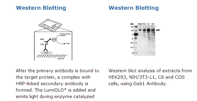 多克隆抗体是由合成的针对人源的Gab1 蛋白Tyr472肽段或针对Gab1蛋白Tyr307或Gab2蛋白Ser159磷酸化肽段免疫动物生产的,并用蛋白质A和肽亲和层析技术纯化。单克隆抗体是由针对重组的人源的Gab2蛋白肽段或合成的人源的针对Gab1蛋白Tyr627或Gab2蛋白Tyr452磷酸化肽段免疫动物生产的。Gab Antibody Sampler Kit为您提供一个经济的手段检测Gab1和Gab2总蛋白及特定位点磷酸化的Gab1和Gab2蛋白。Kit包含足够的试剂且每个一抗可以做四次western blot 实验。Grb相关结合因子(Gab)家族是一类由众多受体酪氨酸激酶(RTKs),如EGFR,HGFR,胰岛素受体,细胞因子受体和B细胞抗原受体招募的接头蛋白。RTKs受到它们的同源配体刺激后,Gab被招募到细胞膜上,被磷酸化,并作为一个支架(1-4)。Gab1蛋白存在多个酪氨酸磷酸化位点(5)。Tyr472位点磷酸化可以调节其与PI3K激酶的p85亚基(6,7)。Gab1的Tyr307,373和407位点磷酸化可以调节Gab1与PLCγ互作(8)。Tyr627和659位点磷酸化是Gab1结合并活化蛋白酪氨酸磷酸酶SHP2所必需的(6,9)。Gab2是最近发现的Gab家族接头蛋白,包含一个pleckstrin同源结构域及潜在的含SH2和SH3结构域蛋白的结合位点。已发现gab2支持一些造血干细胞生长,分化和行使功能(10)。