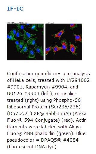 Phospho-S6 Ribosomal Protein (Ser235/236) (D57.2.2E) XP® Rabbit mAb (Alexa Fluor® 594 Conjugate) detects endogenous levels of ribosomal protein S6 only when phosphorylated at Ser235 and Ser236.