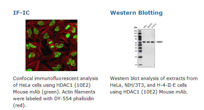 Polyclonal antibodies are produced by immunizing animals with synthetic peptides corresponding to the carboxy terminus of human HDAC5 protein. Antibodies are purified by protein A and peptide affinity chromatography. Monoclonal antibodies are produced by immunizing animals with a recombinant protein specific to the carboxy terminus of human HDAC6, the amino terminus of human HDAC4 protein or with synthetic peptides to the carboxy-terminal residues of human HDAC1 and HDAC2 proteins. HDAC3 (7G6C5) monoclonal antibody is produced by immunizing animals with recombinant human HDAC3 protein.