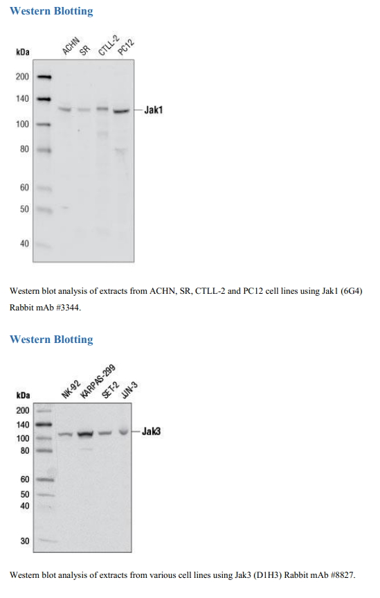 Each isoform-specific antibody is produced by immunizing animals with a synthetic peptide that is specific for the Jak isoform. Jak1 and Jak3 antibodies are purified by protein A and peptide affinity chromatography. Each Jak antibody included in this kit is specific and does not cross-react with the other isoforms.