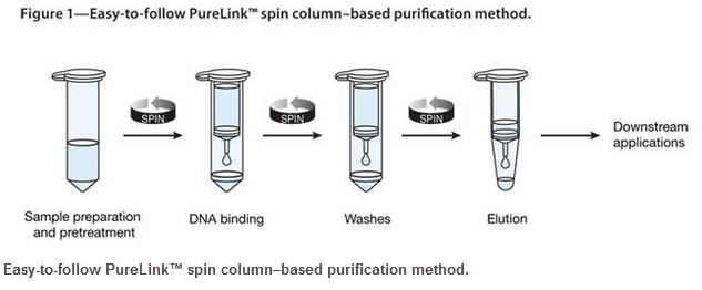 The PureLink® Genomic DNA Mini Kit protocol improves upon the easy, familiar spin-column methods currently in use (Figures 1 and 2). Columns are newly configured to bind and release DNA more efficiently. Samples are lysed in an optimized buffer formulated to enhance proteinase K activity and eliminate protein contamination. The chaotropic salt binding buffer allows the highest DNA binding of any column method. Powerful wash buffers remove all traces of protein and salt. DNA is eluted in a low-salt buffer to allow for pH stabilization of the DNA in storage.
