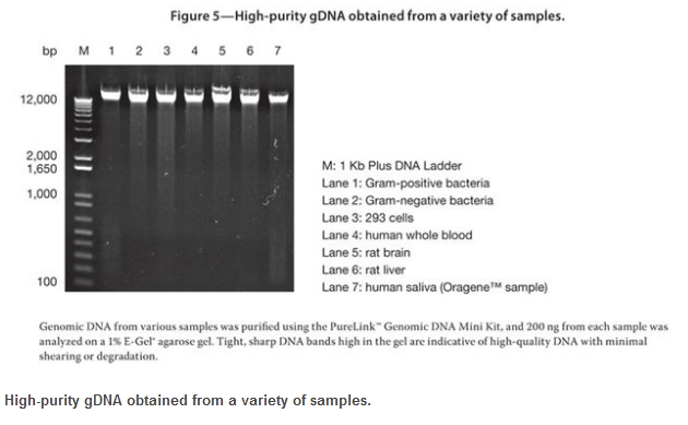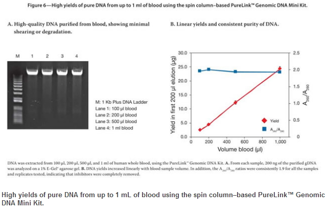 With the PureLink® Genomic DNA Kits, youll get greater yields of higher-purity gDNA (determined by A260/A280 measurements) with all of your sample types - from bacteria to tissues to blood to cells (Figures 4-6). The PureLink® 96 Genomic DNA Kit outperforms competitor products in both DNA yield and purity for multiple sample types, including blood (Figure 7). A260/A280 and A260/A230 ratios of PureLink® gDNA are higher than those obtained with other kits, indicating no contamination carryover of protein or guanidine using the enhanced PureLink® Lysis and Wash Buffers (Figure 7).