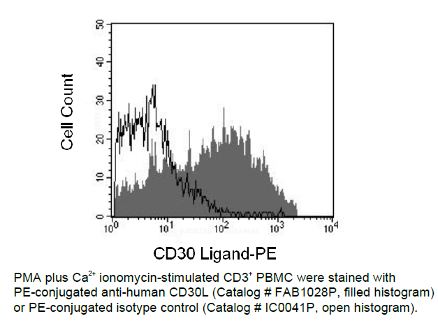 Phycoerythrin (PE)-conjugated mouse monoclonal anti-human CD30 Ligand: Supplied as 25 μg of antibody in 1 mL saline containing up to 0.5% BSA and 0.1% sodium azide.