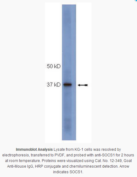 Application Notes Immunoblot Analysis: 1:1,000 dilution of this antibody detected SOCS1 in KG-1 cell lysate.
