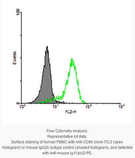 Flow Cytometry Analysis: A 1:100-125 dilution of this antibody detected CD86 in human PBMC's.