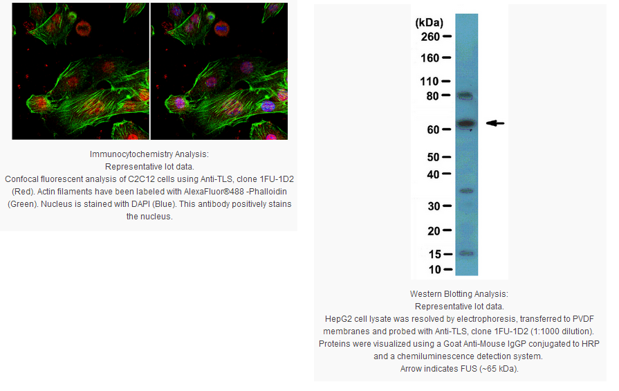 Application Use Anti-TLS Antibody, clone 1FU-1D2 (Mouse Monoclonal Antibody) validated in WB, ICC to detect TLS also known as 75 kDa DNA-pairing protein, FUS-CHOP fusion protein.