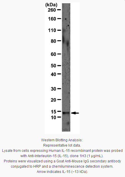 Anti-Interleukin-15 (IL-15) Antibody, clone 1H3 detects level of Interleukin-15 (IL-15) & has been published & validated for use in WB.
