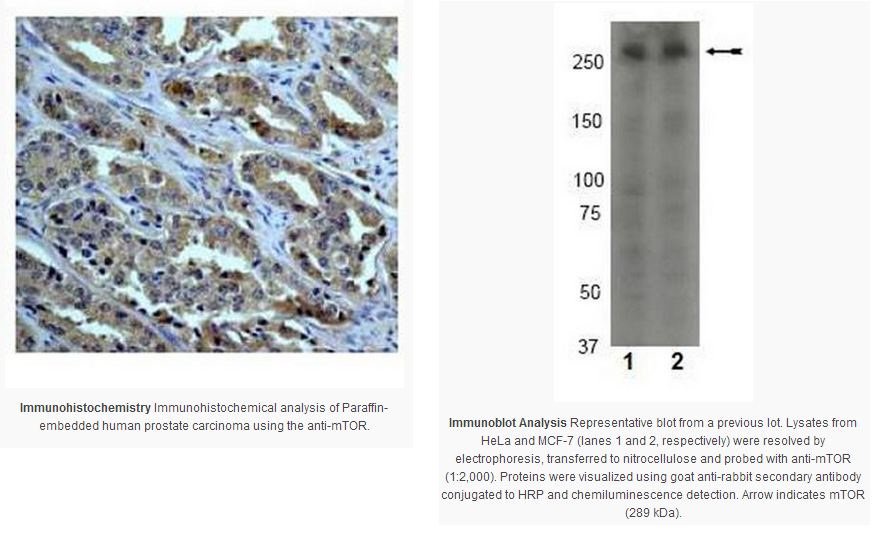 Please note that this product will not be available for sale after March 15, 2015. Please select one of the other antibodies against this target. This Anti-mTOR Antibody is validated for use in FC, IC, IH(P), IP, WB for the detection of mTOR.